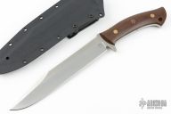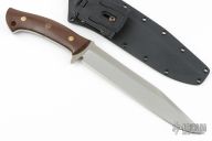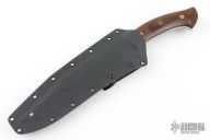 This knife from Tom Krein features a satin finished blade with a false top edge, .199" blade stock and 1.308" blade depth, full tang construction. The handle has green canvas micarta scales with brass and mosaic pins and a lanyard hole on pommel. Includes kydex sheath with Tek-Lok. Has some light patian, otherwise excellent condition. This is one of the largest fixed blades that Tom makes, and this one has and extra long blade. Hasn't been made in many years. This one is dated 2005. Tom said this one was made with an extra 2.5" in the blade.