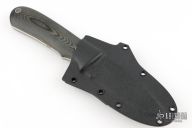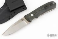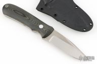 This KM-3 by Dozier Knives features a satin finished blade with a sharpened top edge, .142" blade stock and 1.015" blade depth, full tang construction. Black linen micarta scales with aluminum pins. Comes with a kydex sheath. Excellent condition.