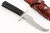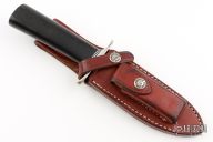 This Combat Companion by Randall Made Knives features a satin finished blade with sharpened top edge and sawteeth, .243" blade stock and 1.164" blade depth, full tang construction. Black linen micarta handle and nickel silver double guard. The Combat Companion is one of Randall's non-catalog knives. Includes a brown leather sheath. Has a couple light scratches, otherwise excellent condition.