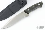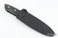 This KM-12 Bowie by Dozier Knives features a satin finished clip point blade with sharpened top edge, .199" blade stock and 1.540" blade depth, full tang construction. The handle has black linen micarta scales with aluminum pins and lanyard hole. Comes with kydex sheath with belt loop. Excellent condition.