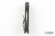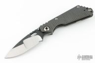 This SNG by Mick Strider features a nightmare ground blade with a notched thumbrest and thumbhole and black textured flats. The handle has a flame finished titanium frame and tip up clip. Excellent Condition. Comes with a zippered case.