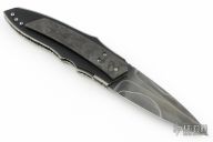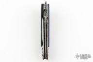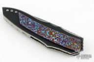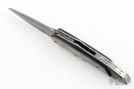 The Xplain Flipper by Corrie Schoeman features a blade with a false top edge, hamon, fileworked spine and under ricasso. The handle has a mokuti front scale over black G-10, marble carbon fiber tip down clip on the other side, fileworked titanium liners and backspacer with abalone inlay. Rides on bearings, nice detent, lockup and blade seating. Excellent condition. Comes with a zippered case.
