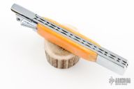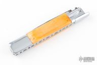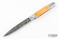 This Picklock Auto by Agasi Hambartsumian of Armenian Doctor Knives features a Damascus bayonet ground blade with a false top edge. The handle has a polished stainless steel frame with fileworked stainless steel backspacer, dyed bone scales with brass pins. New from maker.
