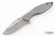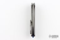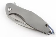 This Arius by Koenig knives features a stonewashed blade with thumbhole and flipper. The handle has a nicely milled and contoured tumble finished titanium frame with matching tip up clip and an anodized and tumbled titanium backspacer. Has ceramic bearings and a ceramic detent ball. Nice detent, lockup and blade seating. Comes with original box and COA dated 9/20/17. Has some scratches. Great condition otherwise. Appears to be a Gen1 with no number on the card or in the clip window.