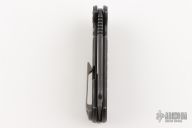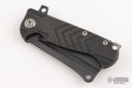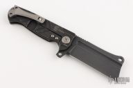 This ADV Mini Cleaver framelock flipper by Andre De Villiers features a black cerakoted blade with notched flipper and thumb rest. Handle has a black cerakoted titanium frame, matching titanium back spacer and titanium clip with roller. Nice smooth action, detent, lockup and blade seating. Comes with Maker's zipper case. Excellent condition.