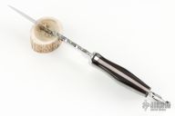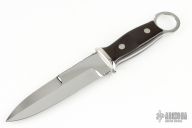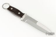 This knife by R. Nelson features a mirror polished blade with sharpened top edge and fileworked spine, .180" blade stock and 1.326" blade depth, full tapered tang construction. The handle has a stainless steel guard and black linen micarta scales with red liners. #193 on the blade. Excellent condition.
