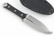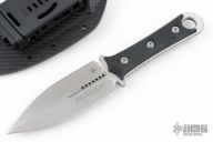 This SBD by Microtech Knives and Borka Blades features a stonewash finished double-edged blade with .188" blade stock and 1.556" blade depth, full tang construction with black G-10 scales. Comes with the original kydex sheath. Excellent condition. Dated 12/2020 and S/N 528