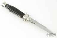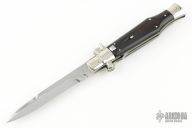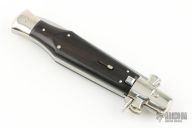AGA Campolin 11" Blackwidow with Brazil Horn! This Campolin made automatic knife has solid nickel silver bolsters with maltese cross in the hilt. To close this one you use the lock back release at rear of the handle. This makes for very tight and stable construction and it's a bit more robust because of that. Has a mirror polished blade with false top edge. The nickel silver liners and a stainless steel backspacer. Ebony wood inlays. Comes with leather slip and Certificate. Excellent Condition.