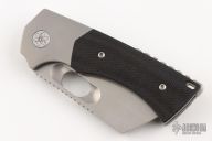 This Thick Boy WharnCleaver Linerlock Flipper by EMP EDC features a stonewash finished blade with notched thumbrest and flipper, and a thumbhole. The handle has a tumble finish milled frame, titanium backspacer and tip up clip, black micarta scales. Rides on bearings, nice detent, lockup and blade seating. Comes with original box and COA. Has some scuffs and scratches, otherwise Excellent condition.
