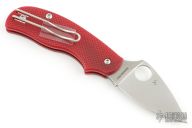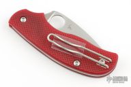 This Urban knife by Spyderco features a satin finished blade with thumbhole and notched thumbrest. The handle has red G-10 scales with a reversible tip up clip. New condition. Comes with original box.