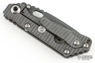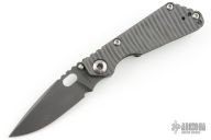 This JVA by Mick Strider is larger than a PT, but smaller than an SNG. It features a black blade with notched thumbrest and thumbhole. The handle has a flame finished titanium frame with matching tip up clip. New condition.