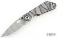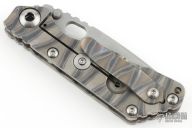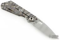 This JVA by Mick Strider is larger than a PT, but smaller than an SNG. It features a ghost striped blade with notched thumbrest and thumbhole. The handle has a Disruptive Strider Stripe finished titanium frame with matching tip up clip. New condition.