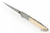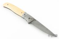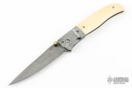 This Linerlock by CC Knife features a Damascus blade with false top edge, single thumbstud with bone inlay. The handle has fluted and fileworked Damascus bolsters, fluted bone scales, stainless steel liners and fileworked backspacer. Nice detent, lockup and blade seating. Excellent condition.