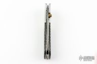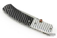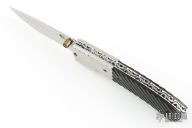 This Linerlock by CC Knife features a satin finished blade with single thumbstud with orange stone inlay. The handle has fluted stainelss steel bolsters, fluted buffalo horn scales, fileworked  stainless steel liners and backspacer. Excellent condition.