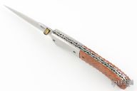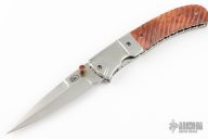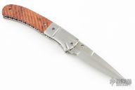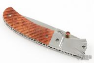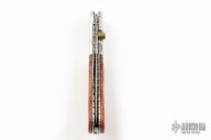 This Linerlock by CC Knife features a satin finished blade with false top edge, single brass thumbstud with orange stone inlay. The handle has fluted and fileworked stainless steel bolsters, fluted burl wood scales, fileworked stainless steel liners and backspacer. Nice detent, lockup and blade seating. Excellent condition.