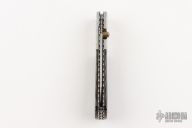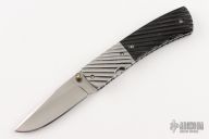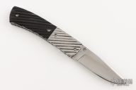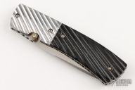 This Linerlock by CC Knife features a satin finished blade with false top edge, single brass thumbstud with yellow stone inlay. The handle has fluted stainless steel bolsters, fluted buffalo horn scales, fileworked stainless steel liners and backspacer. Nice detent and blade seating. Excellent condition.