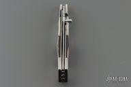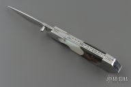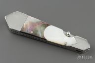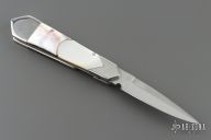 This knife by DC Customs features a mirror polished blade with false top edge and a single thumbstud. The handle has polished stainless steel bolsters, mother of pearl and black lip pearl scales, stainless steel liners and fileworked backspacer. Nice detent, lockup and blade seating. Has a couple light scratches, otherwise excellent condition.
