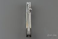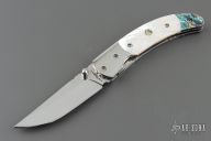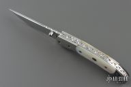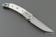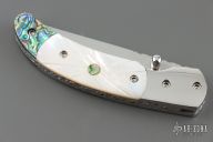 This knife by DC Customs features a mirror polished blade with a single thumbstud and fileworked blade spine. The handle has polished stainless steel bolsters, fluted mother of pearl and abalone scales, fileworked stainless steel liners and backspacer. Nice detent, lockup and blade seating. Has a couple very light scratches, otherwise excellent condition.