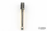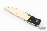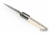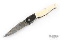 This knife by DC Customs features a Damascus blade with single thumbstud with mammoth ivory inlay, notched thumbrest. The handle has buffalo horn bolsters, mammoth ivory scales, stainless steel liners and fileworked backspacer. Nice detent, lockup and blade seating. Has a couple light scratches, otherwise excellent condition.