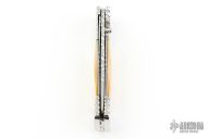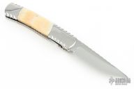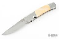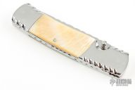 This knife by DC Customs features a mirror polished blade with fileworked spine and a single thumbstud. The handle has polished and fileworked stainless steel bolsters, gold lip pearl scales, fileworked stainless steel liners and backspacer. Nice detent, lockup and blade seating. Has a couple light scratches, otherwise excellent condition.