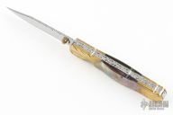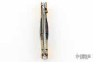 This knife by DC Customs features a mirror polished blade with fileworked spine and a single brass thumbstud. The handle has fileworked brass bolsters, abalone scales, fileworked stainless steel liners and backspacer. Nice detent and lockup. Has a couple light scratches and patina, otherwise excellent condition.