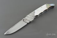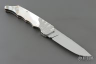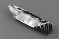 This knife by DC Customs features a mirror polished blade with fileworked spine and a single thumbstud. The handle has fluted and polished stainless steel bolsters, mother of pearl and abalone scales, fileworked stainless steel liners and backspacer. Nice detent and blade seating. Has a couple light scratches, otherwise excellent condition.