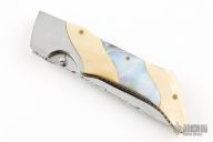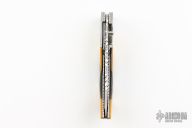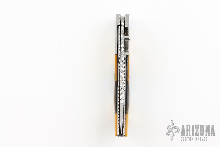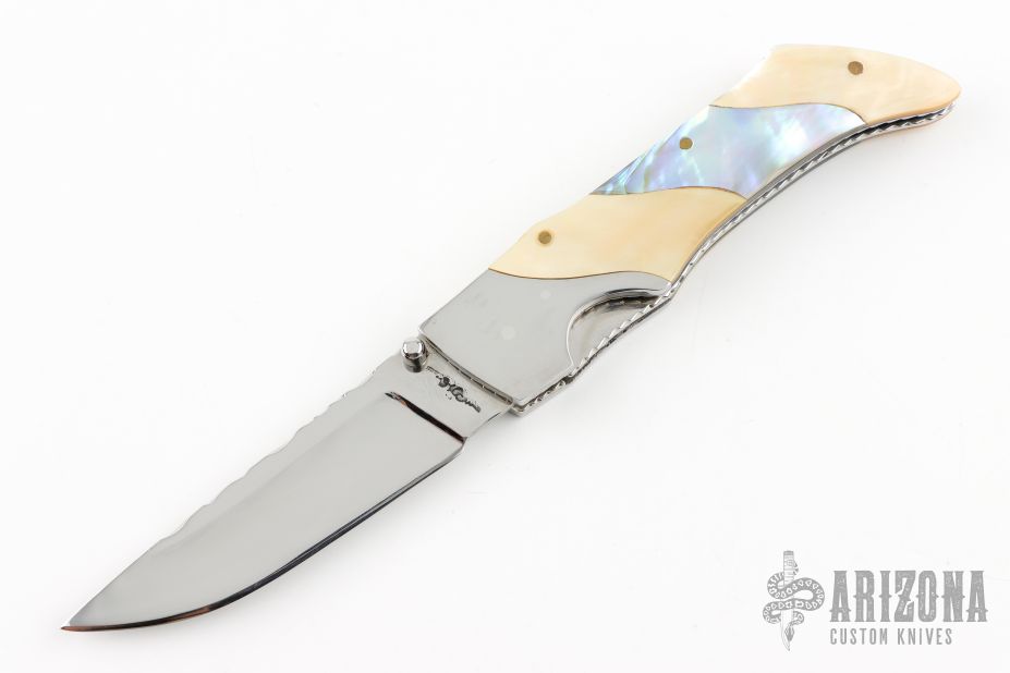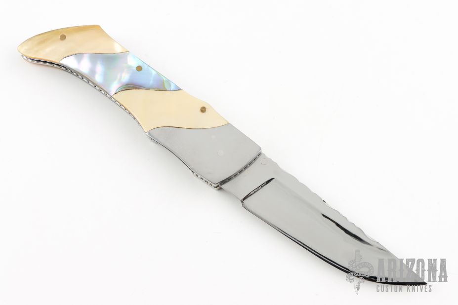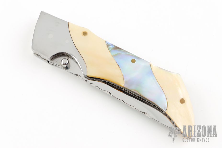 This knife by DC Customs features a mirror polished blade with fileworked spine and a single thumbstud. The handle has polished stainless steel bolsters, black and gold lip pearl scales, fileworked stainless steel liners and backspacer. Nice detent and blade seating. Has a couple light scratches, otherwise excellent condition.
