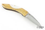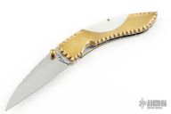 This knife by DC Customs features a mirror polished blade with a single brass thumbstud and fileworked blade spine. The handle has fileworked brass scales with mother of pearl inalys, fileworked stainless steel liners and backspacer. Nice detent, blade seating and lockup. Has a couple light scratches and patina, otherwise excellent condition.