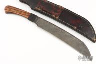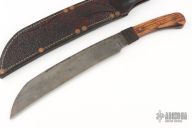 This fixed blade is marked, but we dont' know who made it. It has a hand forged blade with hammer marked flats, .185" blade stock and 1.580, hidden tang construction. Wooden handle with wrapped hilt. Comes with a leather sheath. Has patina, good condition.