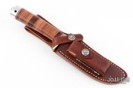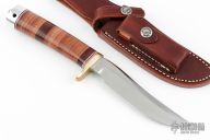 This Model 3-5 by Randall Made Knives features a satin finished blade with false top edge, .174" blade stock and 1.040" blade depth, hidden tang construction. The handle has a brass guard, stacked leather grip with red/white/blue spacers, duralumin butt. Comes with a brown leather sheath with sharpening stone, Randall pin, and a zippered case. Excellent condition.