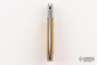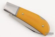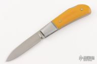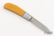 This lockback by Honoré Vilain features a hand rub satin finished blade. The handle has threaded bolsters with integral liners, Vintage Cheddar paper micarta scales with domed pins, stainless steel backspacer. Nice lockup and blade seating. Comes with a velcro case. Excellent condition. Very nicely done!