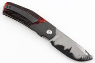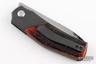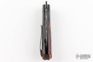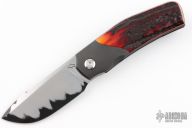 This Small Sirius by Guy Poggetti features a San Mai blade with swedge, notched thumbrest, and front flipper style opening. The handle has black titanium bolsters, amber stag scales, black titanium liners, carbon fiber backspacer with lanyard pin and a black titanium tip up clip. Rides on bearings, nice detent, lockup and blade seating. Comes with zipper case and COA. Excellent condition.