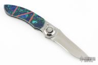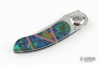 Opening and closing is by the Paul Presto axial mechanism designed by Paul Poehlmann. Has a satin finished recurve blade. Stainless frame with Genuine green malachite and coral overlays. Comes with original box, metal case and COA. Excellent condition.