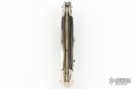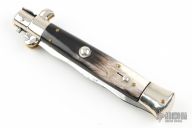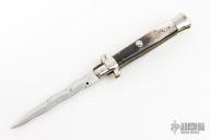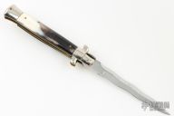 This pick lock auto by B Svobody is vintage. It features a Kris ground blade with a false top edge. The handle has nickel silver guard and rear bolster and buffalo horn scales, brass liners, steel backspacer with round lock tab. Has nickel silver button and safety. Has scratches and a little patina, otherwise good condition for its age.