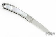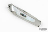 This Lockback by Moki features a mirror polished blade with nail nick. The handle has a mirror polished stainless steel frame with mother of pearl inlays and an abalone escutcheon, stainless steel backspacer. Comes with original box and nylon sheath. Excelletn condition.