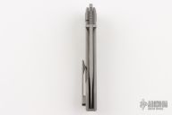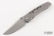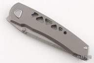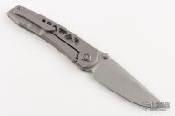 This Waka by Edison Barajas features a laser engraved blasted blade with notched thumbrest and dual thumbstuds, can be front flipped. The handle has a milled and blasted titanium frame with matching backspacer and tip up clip with hidden screws. Has custom pivot. Rides on bearings, nice detent, lockup and blade seating. Comes with original box and COA.  New from Maker!