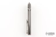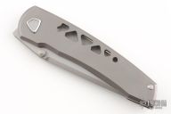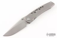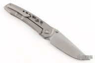 This Waka by Edison Barajas features a blasted blade with notched thumbrest and dual thumbstuds, can be front flipped. The handle has a milled and blasted titanium frame with matching backspacer and tip up clip with hidden screws. Has custom pivot. Rides on bearings, nice detent, lockup and blade seating. Comes with original box and COA.  New from Maker!