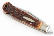 This lockback by Rigid Knives features a clip point satin finished blade with nail nick. The handle has nickel silver bolsters, faux jigged bone scales, brass liners and a stainless steel backspacer. Nice lockup. Excellent condition. Comes with original box.