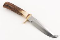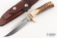 This Model 5-5 by Randall Made Knives features a satin finished blade with false top edge and notched thumbrest, .205" blade stock and 1.047" blade depth, hidden tang construction. The handle has a brass guard, stag grip red/white/blue spacers. Comes with original brown leather sheath. Excellent condition.