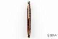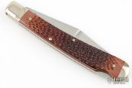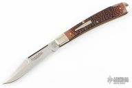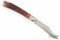 This knife features a satin finished blade with a single nail nick. The handle has nickel silver bolsters, faux jigged bone scales, brass liners and a stainless steel backspring. Includes the original box and papers. Excellent Condition.