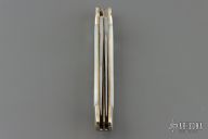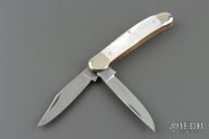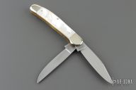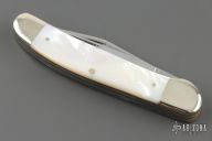 This Trapper from Bull Dog Brand Knives features polished blades with nail nicks. The handle is comprised of nickel silver bolsters, mother of pearl covers over brass liners and stainless steel backsprings. Excellent condition. Comes with original box.