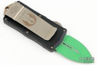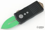 This Microtech Exocet features a green finish spear point blade. The handle has a black aluminum handles and a stainless clip that doubles as a money clip dated 02/2022 s/n 008. Comes with original box and papers. Excellent Condition.