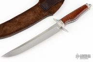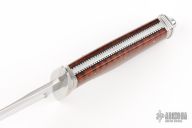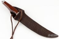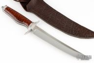 This Fighter by Gilles Hebert features a hand rub satin finished blade with false top edge, .170" blade stock and 1.289" blade depth, hidden/frame tang construction. The handle has an engraved 304SS guard with 24kt gold inlays, fluted stainless steel collar and butt, stainless steel frame, coin edged liners, snakewood scales, tang nut with lanyard hole. Comes with a brown leather sheath. Comes with a COA. New from maker!