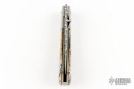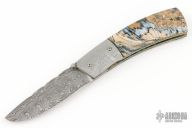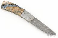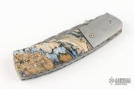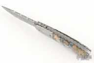 This LL-N linerlock folder by George Muller features a Hakkapella Damasteel blade with fileworked spine and a single thumbstud. The handle has dovetailed meteorite bolsters, and mammoth tooth scales with brown liners, anodized and fileworked titanium liners, Damascus backspacer. Nice detent, blade seating and lockup. Comes with a velcro case. Excellent condition.