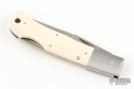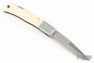 This stunning lockback folder by Jess Horn features a hand rubbed satin finished clip point blade with false top edge and nail nick. Satin finished stainless steel bolsters with beautiful matching mammoth ivory scales, hand peened nickel silver pins, and stainless steel liners. Satin finished backspacer is stainless steel and black linen micarta, and butt of handle has lanyard hole. All the lines of this knife line up perfectly. It is a truely beautiful knife. Numbered 249. Comes with Jess Horn leather zippered case. Excellent condition.