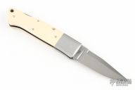 This lock back folder by Jess Horn features a satin finished clip point blade with false top edge and nail nick. Stainless steel bolsters with mammoth ivory scales, nickel silver pins, and stainless steel liners. Backspacer is stainless steel and black linen micarta, and butt of handle has lanyard hole. Numbered 011. Comes with Jess Horn leather zippered case. Excellent condition.