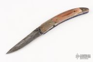 This knife by Frank Niro features a Mosaic Damascus blade with single thumbstud with a round black stone inlay. The handle has hot blued Mosaic Damascus bolsters, mammoth ivory scales, anodized and fileworked titanium liners, fileworked stainless steel backspacer with abalone and emerald inlays. Nice detent, blade seating and lockup. Has a small oxidation spot on one of the rear bolsters, otherwise excellent condition. Comes with a Velcro case.  One of the screws has some oxidation.