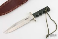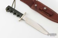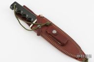 This Model 14 by Randall Made Knives features a satin finished blade with sharpened top edge, .193" blade stock. 1.350" blade depth, full tang construction. The handle has a nickel silver guard, black canvas micarta handle with a lanyard hole at the butt. This knife was designed to meet the demand for an almost indestructible all-purpose knife, though it is especially suited for combat and survival purposes. Comes with brown leather sheath and a Randall zippered case. Excellent condition.