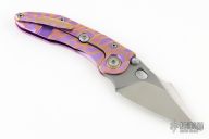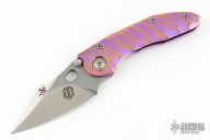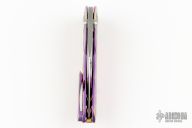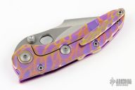 This Custom Stitch by Borka Blades and John Gray features a satin finished blade with thumbhole, and dual thumbstuds. The handle has a sculpted/anodized titanium frame with a matching titanium clip that is positioned for tip up carry, bead blasted and bronzed hardware and lockbar stabilizer, anodized titanium pivot collars. Blade is centered when closed. Nice detent, blade seating and lockup. Comes with zippered case and COA. New from maker.