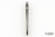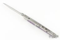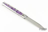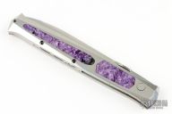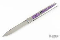This Hidden Release D/A Automatic by Jeffrey Harkins features a hand rub satin finished drop point blade with a notched thumbdisc. The handle has a hand rub satin finished stainless steel frame with Charoite inlays over a fileworked stainless steel backspacer/spring. Nice action, detent, lockup and blade seating. Has some light scratches, otherwise excellent condition. Comes with a zippered case.